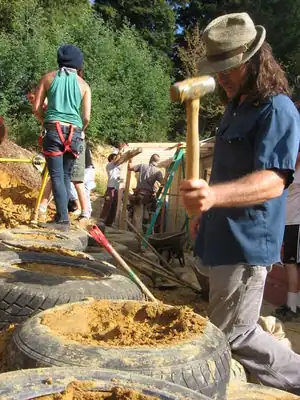 Earthen construction is hard work! But that is part of what makes it an appropriate technology. We used common gardening tools to fill tires and cut a garden bed into the hillside. This required a lot of hard labor. We used waste materials, such as the used tires and small logs to build the retaining walls. We used great compost from CCAT, which mixed in with our top soil and amendments will be dynamite for the herb garden CCAT is planning on planting in the growing season. The whole project was not overwhelmingly technical and that is why I think it was so successful. I think that anyone who would like to build a sturdy retaining wall and/or garden bed, with recycled materials, and a limited budget, will find this project a useful inspiration.