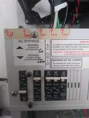 | Outlet attached to the inverter isn't channeling a current to the extension cords that are used to power items. | ![]() MEOW reset breaker box tape instructions First, hit reset on the outlet inside the MEOW then check again if it is still not working Next, check the voltage of the batteries. In our current system if the voltage is around 40V then the batteries are drained and the inverter will no longer pull energy from the batteries to prevent permanent damage to the batteries. Allow time for the solar panels to charge batteries up to at least 48V. Check the breakers and make sure they are aligned as they should be and that everything is connected |