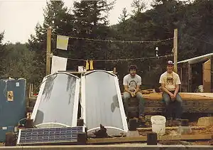 The old stand-alone PV system at CCAT consisted of 22 Solec International photovoltaic panels, a Whisper wind turbine, and a backup generator. The PVs were donated in the 1980s from the Flat Plate Array Project at the Jet Propulsion Lab. The output from the 22 panel array was about 700 watts peak on a sunny summer day. The Whisper H500 wind turbine, standing 43 feet (13 m) tall and using a World Power control box, generated very little, due to the site's poor wind energy potential. Part of the problem was that the surrounding trees had grown considerably since the original wind generator was first installed on that tower in 1984. Energy generated during the day was stored in a 24 volt battery bank consisting of twelve, Trojan L-16 batteries. A Trace C40 charge controller regulated the battery voltage during charging. Twelve volt DC loads were supplied via a Vanner battery equalizer, and AC loads were supplied using a Trace SW4024 inverter. A biodiesel engine generator was used to charge the battery bank as needed. The solar-electric modules from the old system are now being used for learning opportunities at CCAT. Students in a variety of classes and workshops will have a chance to wire up the panels and test their output.