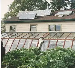 In May of 1991, CCAT installed a PV solar system. This system ran off the grid for 10 years generating power for the CCAT house along with a wind turbine and backup bio diesel generator. In 2001, a new grid tied PV system of 8 ASE-300-DGF/17 modules of 300 Watts each. This system ran for only a few years before the CCAT house was moved several hundred feet to the southwest to make room for the BSS building at HSU in 2005. It has since been reconnected in 2008 and is still grid tied.