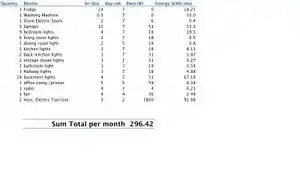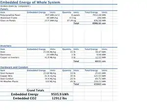 The embedded energy data came from the Inventory of Carbon and Energy[2] (created by Geoff Hammond and Craig Jones from the University of Bath, UK), execpt for the polycrystalline panels which came from a study that estimates the amount of energy per m^2.[3] and for electronics.[4] The quantities of construction materials were estimated by physical inspection when exact weights were unknown.
