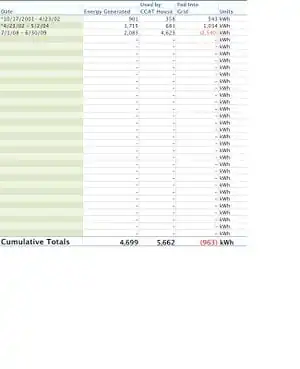 PG&E provided the energy production of CCAT's panels from the last annual billing cycle (7/08-6/09). It is assumed the panels will produce this amount annually until the embedded energy is recouped.