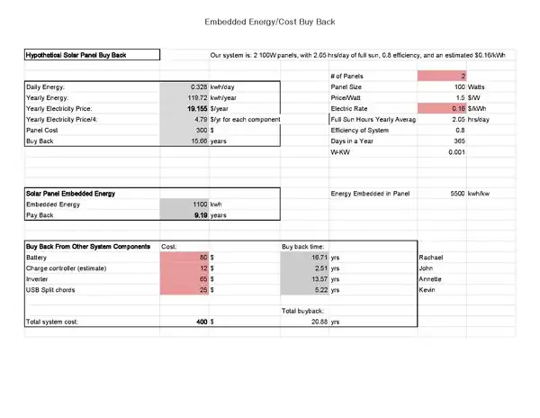 The system will save the campus around $20 each year in electricity costs and will therefore buy itself back in about 21 years. ($400/$19.12/year = 20.88 years).