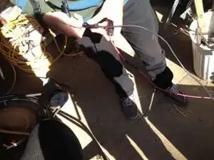 3. touch and hold this wire to the end of the inverter positive cable away from the vicinity of the battery (a spark is normal and indicates the capacitors are charged)