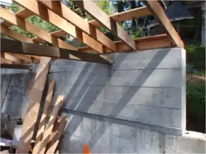 Construction started on the shed with the preparations with the foundation. Three (3) 2'x2'x2'holes had to be dug out of the existing slab for the foundation of the three supporting 2x6 columns. These blocks of concrete are for the potential uplift created by the overhang of the roof. Three stem wall forms were built to provide a platform for the future alternatively built walls to be placed out of moisture. A stem wall was also built on top of the existing retaining wall to give the back side of the roof the desired height. Because the existing retaining wall dog legs down on the south side, bigger forms were built to raise the back wall up level all the way across for the span of 24.'