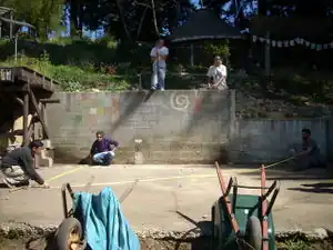After the forms were all built, all of them were reinforces with #4 rebar. The stem walls laid on the existing slab were keyed in with rebar to prevent them from lateral movement. The concrete was donated from Eureka Ready Mix Concrete Co. Inc., and the pump truck was also donated from Powel Pumps. On poor day the whole retaining wall, which was made of cinder block, was filled all the way across up to the top of the forms. The stem wall and 2'x2' blocks were also filled on the slab. Before drying, 5/8 inch anchor bolts were placed 4' o/c for the sill plate on the back wall. For the three supporting 4x6 posts, Simpson Strong Tie CB46 were placed so the beams could be directly attached to the foundation. The whole project required 9 yards of concrete to complete.