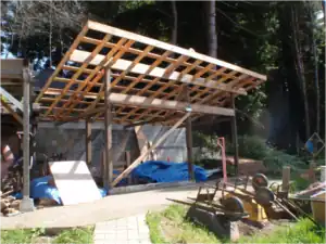 As of this writing in May 2010, the shed is a standing skeleton of timber and roof. The three walls are about half way built, and will hopefully be done before summer. Some projects that still need to be done are as follows: