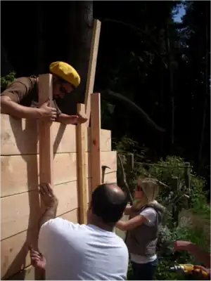 The design as a whole was also carefully planned out to meet CCAT's mission statement and goals. The open, timber frame design allowed many more options compared to conventional framing. The walls of the project allowed CCAT to demonstrate three different alternative ways to close in a house. As of spring 2010, the walls were decided to be a cord wood wall, slip straw, and a cob wall with inlaid recycled glass bottles to allow light in. The open space above the west wall allows there to be windows for the clear story. This lets in natural light as opposed to wiring the shed using electricity.