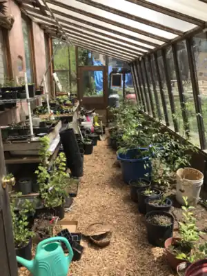 The CCAT greenhouse is a prefabricated model from Sturdi-Built which is a greenhouse manufacturer based in Portland, Oregon. The CCAT greenhouse is a lean-to Garden Sun Room model frame and glazing. It is supported by a freestanding beach grass and clay slip wall. The frame of the greenhouse is made from Clear All Heart grade redwood that is resistant to decay. The glazing in the greenhouse is of various types. The glass in the roof and door is tempered safety glass and the wall glass is standard lapped glass. The redwood beams of the roof are also designed to channel condensation down to the side of the wall and to drain spouts to keep water off of gardeners. Ventilation of the greenhouse structure comes from three sources. Cooler air is allowed to circulate in through the ground level, low wall, screened vent panels. In addition there are the mid wall slat vents called Jalousie Windows. Hot, moist air is allowed to escape through the roof vents to control temperature and humidity. These are the key factors in greenhouse success. These vents are the most crucial and are operated by solar powered Bayliss MK7 vent openers. These openers contain a wax that expands as temperature rises inside the greenhouse, causing them to extend and open the roof vents and allowing warm air to escape due to convection. Typically, greenhouses are heated with a small heater during the cold months of the year. However, given Arcata's mild weather and the thermal mass of the beach grass clay slip wall, no additional heating source is used in the CCAT greenhouse.
