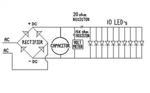 We new that we would not have much more that 2.5 volts to work with, so we used a breadboard and two AA batteries in series to run tests. This produced a 3.00 VDC circuit which made a good simulation of the DC output we desired. We then started placing LED's in parallel with the 3.00 VDC. We were able to place about 15 LED's in parallel before the LED's would not light. We decided to use 10 since we did not know if we would get 3.00 V, and we wanted the lights to be bright. Also, a 20 ohm resistor needed to be placed in series with the LED's so that an unexpected large electrical surge of some sort would not burn out the LED's. First however, we would have to convert our AC current to DC current since LED's only allow the flow of electricity in one direction and therefore require DC current. In order to do this we would have to make or buy a full wave rectifier. AC current pulses back and forth but we only want it going in one direction. A rectifier uses diodes, which only allow electricity to flow in one direction. By arranging four of these diodes correctly in a circuit, a rectifier is made. This rectifier redirects the back and forth pulsing of AC current into a one directional current, DC. However, this does not produce the smoothest current; there are still quick peeks and dips in the current. To over come this, a capacitor may be needed. A capacitor acts as a buffer, much like a battery would. When there is extra power in the circuit, the capacitor stores that extra, but when the power is less in the circuit than in the capacitor, the capacitor releases some of what it has stored. This in effect rounds the peeks and fills the dips, producing a very steady current. We also decided to attach a volt meter so some sort of measurable output could be viewed.