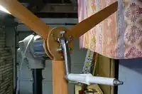 Our hand crank was constructed of an old bicycle crank, a 12" piece of threaded rod, a 10" long piece of 1" steel pipe, and some plastic tubing from an old mop. The threaded rod was fed through the crank were the pedal would normally attach. The pipe was then feed over the threaded rod and the plastic tubing over that. A nut and washer were then placed on each end of the threaded rod, tightening the pipe, crank connection, but still allowing the plastic tubing spin freely on the pipe. This was then bolted to the front plywood blade mount, using the original crank set mounting holes. We had to use a lot of washers with bolts to provide clearance from the bolt heads that hold the blades in place. At this point the blades and mounts were removed and finished with Thompson's deck stain to protect them from water damage that could crack and warp the wood. In hindsight, we could have looked around for an environmentally friendly finish, but we knew this worked well and it was already paid for by our wood lab shop cards.