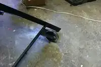 The frame was built out of two reclaimed bed frames that we found stashed in the back yard. We designed a four sided pyramid shape frame that would offer wide support in all directions. We first clamped the four legs in place on the tower while it sat on level ground and then proceeded to try to tack them in place to get a better visual. Every thing was how we liked it so we removed the clamps and two of the four legs fell to the ground. The tower was galvanized and was not getting any penetration on the welds. Using a disk grinder and ventilator we were able to remove the outer galvanized coating and weld successfully. The four legs by themselves did not offer much support. Using the smaller bed frame as cross bracing, the frame became a lot more ridged. The frame also needed to be mobile, so we designed a dolly like mount using training wheels. This would allow the turbine to be easily moved from place to place by one person.