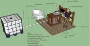 Our wash station has two basic systems, solar collector and drainage. The solar collector must be made with materials that are capable of collecting and retaining heat. Heat retention depends on the type of insulation material. The solar collector uses a natural process called thermosyponing. This process uses the pressure of warm water to push the cooler water, therefore circulating all the water to be warm withing the system. Water storage must be placed above the solar catchment system, so that the warm water pushes to the top. The tank itself must be well insulated, so that during low periods of sun exposure, the water will remain warm. The drainage must properly disperse the water through using mediums made with different sizes of rock and correct slopes (Sitzmann 2019).