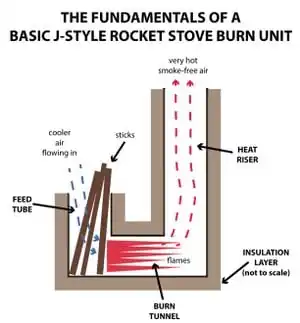 A rocket mass heater, or rocket stove, consists of a right angle 'J' shaped combustion chamber inside of an insulated container. This insulation container creates a draft in which the heat gasses are drafted and then pushed through piping into the mass. This concept can be applied to heat earthen built furniture in homes that contain high thermal mass.[1]