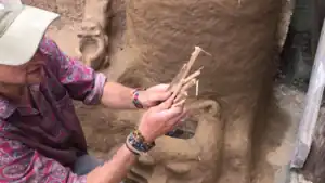 Straw Slip Insulation against bottom foundation- rice straw added to a mixture 4:1 of clay and water.