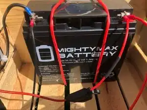 Fig 2: 12 Volt rechargeable sealed lead-acid battery. For our battery the positive side is to the right and the negative is to the left. From the positive side we have a positive red wire from a female adapter connected and the positive red wire with a fuse from the charge controller. On the negative side we have the negative black wires form the charge controller and female adapter.