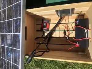 This project was presented to the group as a learning opportunity for the community through CCAT (Campus Center of Appropriate Technology). The idea for this project was to create a solar-powered box that could charge laptops and phones and other small essential items during times when there is no power or in the event of a disaster. Our group was tasked with creating a reproducible small scale photovoltaic system. Our system was designed to be small enough so that it is easily traveled with and mobile but also large enough to power multiple devices. the system we designed utilized a deep cycle golf cart battery and an 80W repurposed solar panel. In addition to these components, there is the charge controller and inverter which can be found online at a reasonable price. Our team began the construction of this project by first prototyping the box by using a cardboard box and a mock solar panel to get an idea of the dimensions. After this, CCAT ordered the parts, and construction began. Construction was completed on May 3, 2020.