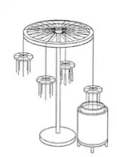 Figure 3 illustrates a continuous dipping process for four or more wick holders suspended from a wheel. Using this method, the wheel is rotated after each dip to enable a fresh set of wicks to be presented for dipping.