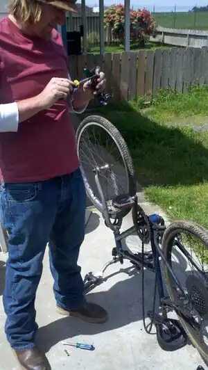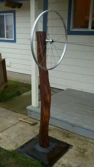 The bike wheel was taken from a donated bike and modified to fit our project. The spokes have been cut off and bent for the graphic inset.