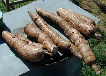 Cassava (Manihot esculenta) is a crop widely grown for its tubers. It is also known as manioc. Originally a tropical American plant, it is now grown in many tropical countries around the world. It is valued for its starchy roots. In appearance, the roots look similar to large sweet potato roots.