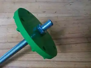 Screw another nut onto the rod. Press the final nut into the handle and screw it onto the threaded rod (crank handle up) until it makes contact with the free nut. Using your fingers, tighten the crank handle while loosening the free nut until the two are firmly fit together.