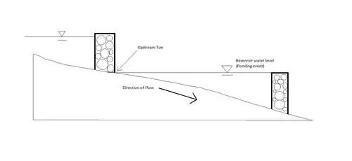 While water level upstream the check dam will rarely remain constant due to Qout, Equation 4 provides a good estimation of the temporary storage potential provided by a specific check dam configuration. Given the depth of water immediately upstream of the check dam, infiltration can be estimated using Darcy's Law for flow through a porous medium.[5]