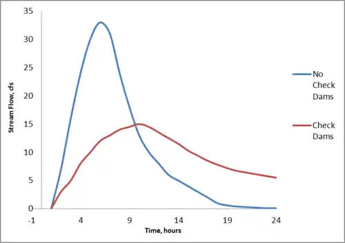 As shown in Figure 4, a typical hydrologic pattern in rainfall-responsive waterways is a short, intense flow of water that quickly dissipates. This flash 'plug' of water is the contributor to erosion and flooding in a waterway. When implemented in series beginning in the upper stages of a watershed, check dams reduce the intensity of the hydrologic peak in a channel following a rainfall event by lengthening the amount of time water in which water is conveyed by the waterway. It is also notable that the time of concentration arrives later in a channel with check dams by adjusting stream gradient[11]; this provides additional flexibility in harvesting options if desired. As sediment accumulates behind a check dam it may become suitable for planting of local vegetation. In some areas, check dams may be used to support fruit trees and cereal crops.[12]