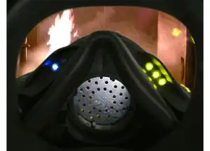A pressuresensor in the inner workings of the helmet delivers information about chemical Substances or the air level in the bottle.A headup display is integrated in the helmet of the protective clothing.