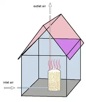 The compost heater silo is the central part of an inhouse compost heater. The composting process is run in an airtight silo, placed in an appropriate part of the building. The produced heat can be distributed by a heating circuit, whereas a simple model of such a compost heater silo does not require a water circulation, radiating the heat directly to the interiors of the house. In autumn the silo is filled up with fresh biomass, after which the silo delivers comfortable heat all winter long.