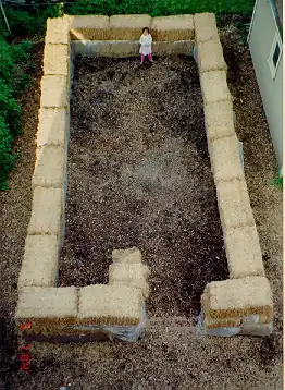 The greenhouse design was similar to inexpensive "tube" greenhouses. Outer dimensions were 16x30 feet. The foundation walls consisted of 3 courses of rye grass straw bales pinned together with 1/2 inch steel rebar. Bale size was 2 feet x 2 feet x 4 feet, giving two-foot thick walls along the base. Therefore inner dimensions were 12 feet wide by 26 feet long. Bales were stacked like bricks, as is typical of straw bale construction. A layer of 3 mil plastic film surrounded the bottom bales, separating the straw from a layer of wood chips on which the bales rested and the compost which filled the greenhouse about three feet deep inside (except for a 5 feet by 12 feet entry at one end). The roof consisted of 6 mil ultraviolet resistant plastic film supported on 20 foot arches of rebar spaced every 2 feet along the length of the structure. These arches were held rigidly into a 2 feet x 2 feet matrix with horizontal rebar spaced every 2 feet running the length of the structure. The straw bales on the sides and end walls were also covered with the same plastic film as the roof with a door framed out of lumber at one end. A single sheet of 32 feet wide by 32 feet long plastic covered the roof.