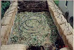 Two PVC 3/4 inch water lines ran underground from the house to the greenhouse. The cold water supply originated at the washer hookup cold line. Hot water returned from the greenhouse in an insulated line after circulating in the hot compost and entered the house plumbing at the washer hot water hookup. Therefore no modifications to the original house plumbing system were required. While the greenhouse heater was operative, the original hot water heater was turned off and its intake valve closed. Heat exchange occurred in the compost in which was embedded one hundred feet of coiled 1.5 inch internal diameter plastic hose. Compost mass totaled 3 feet deep, 12 feet wide, and 21 feet long, or approximately 28 cubic yards. It required replenishing several times during its lifetime because of continual slow decomposition.