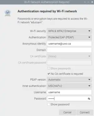 Now that Network Manager has been enabled we have more freedom over how each WiFi network is configured and can connect to WPA2-Enterprise networks.