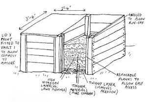 Container composting - There are sound reasons for composting in containers, although there is debate as to whether slatted or closed sided bins are preferable, for this will affect air circulation within the compost pile, as well as the potential for heat loss. The Indore method developed by Sir Albert Howard and the Shewell Cooper method favour slats, while the New Zealand Box method advocates the use of closed sides. There are also differences between these techniques in terms of activators (that is, high nitrogen content organic substances to stimulate high bacterial activity within the heap, e.g., urine, grass mowings, comfrey leaves, etc.) and materials used. However, most agree that a good mixture of carbon and nitrogenous materials, usually created in layers and on a base consisting of rougher, stemmy material (to encourage air circulation) that is in contact with the soil are essential to all successful composting processes.