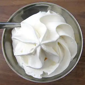 has around a 36% fat content, which allows air to be trapped when whipped, roughly doubling the volume. Once whipped, it can be used to top desserts or fill cakes and pastries.