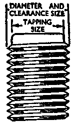 The most satisfactory hand process consists of cutting the internal threads with a set of taps, and the external threads with a die held in a stock. Considering first the use of the taps, it is obvious that if a thread has to be cut on the inside of an object, such as a nut, a hole must be drilled first; since the diameter of all threads is measured to the outside, it follows that for, say, a 1-inch thread, the diameter of the hole must be 1 inch, less the depth of the thread on each side. This point is illustrated in Fig. 3.