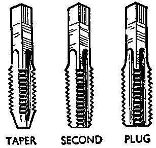 The diameter of the hole to be drilled is called the tapping size. A set of taps of the type used for cutting an internal thread is shown in Fig. 4. It will be noted that there are three taps in the set, all of the same maximum diameter. The taper tap is used first, and it will be seen that for some distance from its end there are no threads. This allows the tap to enter the hole and assists the worker in holding the tap in line with the hole, which is very important if accurate cuts are to be made. The tap-wrench fits the square end of the tap and forms a handle by means of which the tap may be turned gradually into the hole. If a tap is passed. through the hole, a complete thread is cut; but if the hole does not go through the metal, no thread is cut near the bottom of the hole. To make a clean thread in such a blind hole, it is necessary to follow with the second tap which, as can be seen, has only a few threads ground away at the bottom end. Finally, the plug or bottoming tap is used to complete the thread to the bottom of the blind hole.