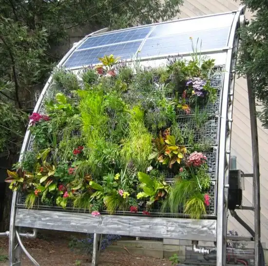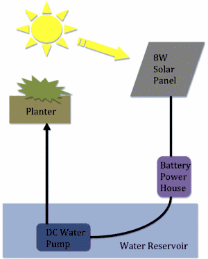 I plan on creating a solar powered vertical vegetable garden. My project will be a version that follows the concept shown in the photo below; where there is a self watering pump that is powered by the sun. I will be creating a low cost and mostly recycled version of the photo below, but also attempt to have a high density crop yield with a solar water pump through a different design. I hope to produce a high density vegetable garden that those on budgets can implement themselves with local resources.