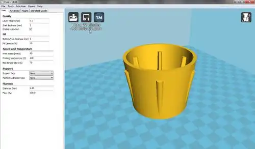 The Cura interface exposes a number of settings relevant to slicing models for printing. Hovering the mouse pointer over a parameter will cause a box to pop up explaining what the parameter does. One parameter to set correctly is the nozzle diameter (Advanced tab) which should be set to 0.5mm. Suggested parameter starting points are listed below, those not in the list can be left at their default value: