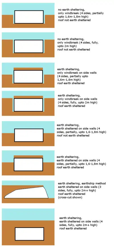 - "A building can be described as earth-sheltered when it has a thermally significant amount of soil or substrate in contact with its external envelope."[1]