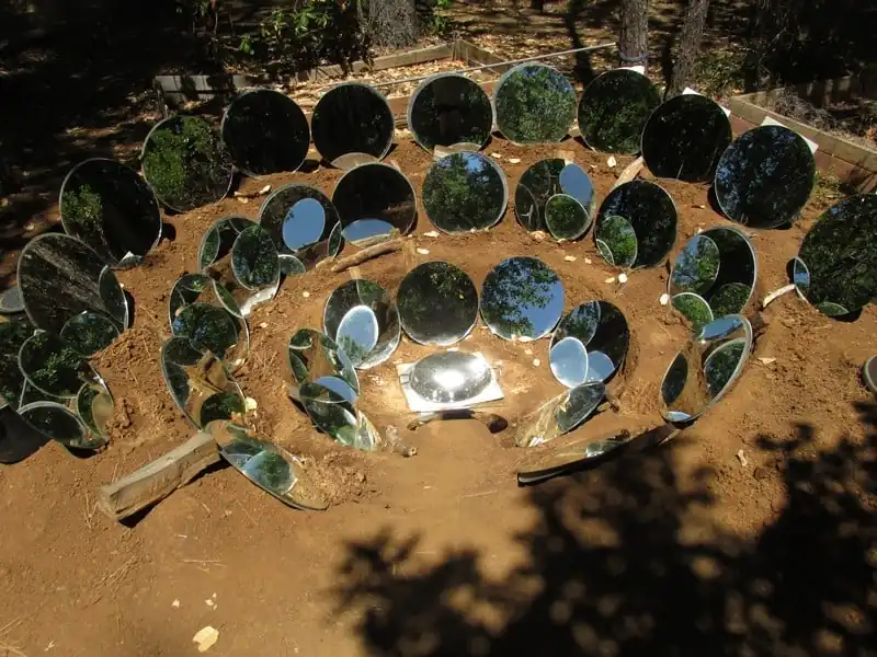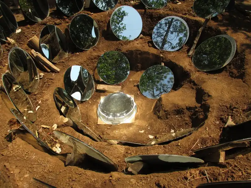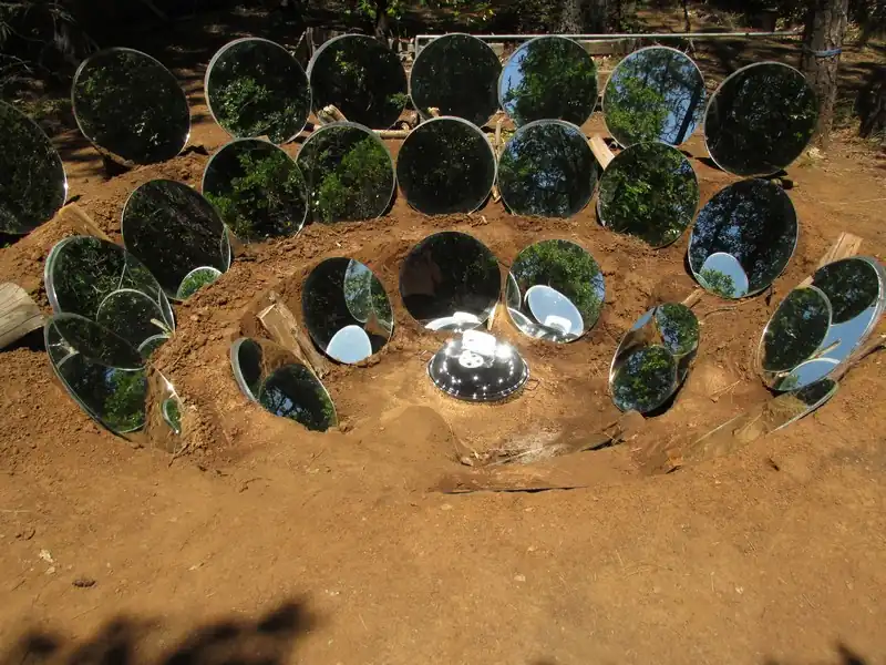 In the photo above, mirrors reflect and concentrate sunlight to the base of the hole where 10 one gallon black containers of water can be boiled per hour and used for drinking or food preparation. (A 2.5m diameter hole, 1.5m deep cooks 10 gal of rice/hr from 11am to 3pm on an 85f summer day in south central Oregon.) Cooking/water boiling containers are accessed via steps carved into the side of the Earthen Solar Cooker. The aluminum mirrors rest upon short lengths of wood twigs pressed into small diameter holes drilled the sides of the hole or upon narrow ledges sculpted along its inner circumference. Since the power of a parabolic concentrator is proportional to the surface area of it's aperture (A = 3.14 x r^2), doubling the radius of the hole increases the power of the Earthen Solar Cooker by a factor of four. A (vegetarian)solar barbecue pit may be possible. An Earthen Solar Concentration the size of a large amphitheater might be capable of casting bronze or boiling the volume water located at the focal point of this excavated parabolic amphitheater sized solar concentrator... within the space bounded by a 10 ft. tall by 10 ft. diameter well wall made of black basalt or black granite and by the plane located at the base of that well wall which is perpendicular to the well's vertical axis, at the apparent excavated ground level.. which is 10 feet below the ground water table level... thus making possible the creation of a solid state solar thermal water pasteurizing bubble pump that could lift pasteurized water to a tank located just above the natural ground level... and if pressurized by securely capping the top of the well wall with a high pressure bulkhead plumbed with multiple spray nozzles... it could also function as a fountain; capable providing safe drinking water for a remote village or refugee camp; helping to improve the short lives of a people who bodies are ravaged by water borne illness.