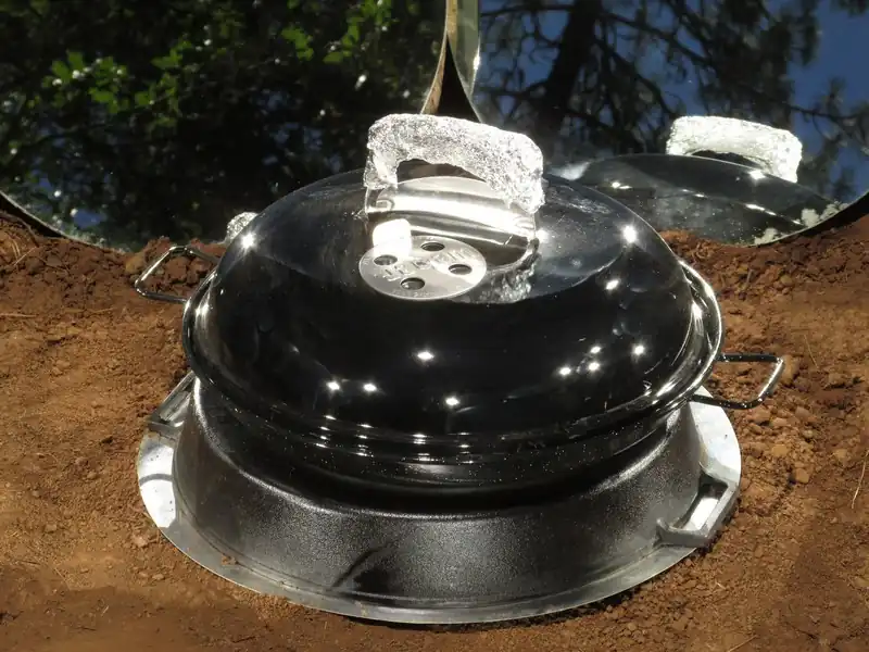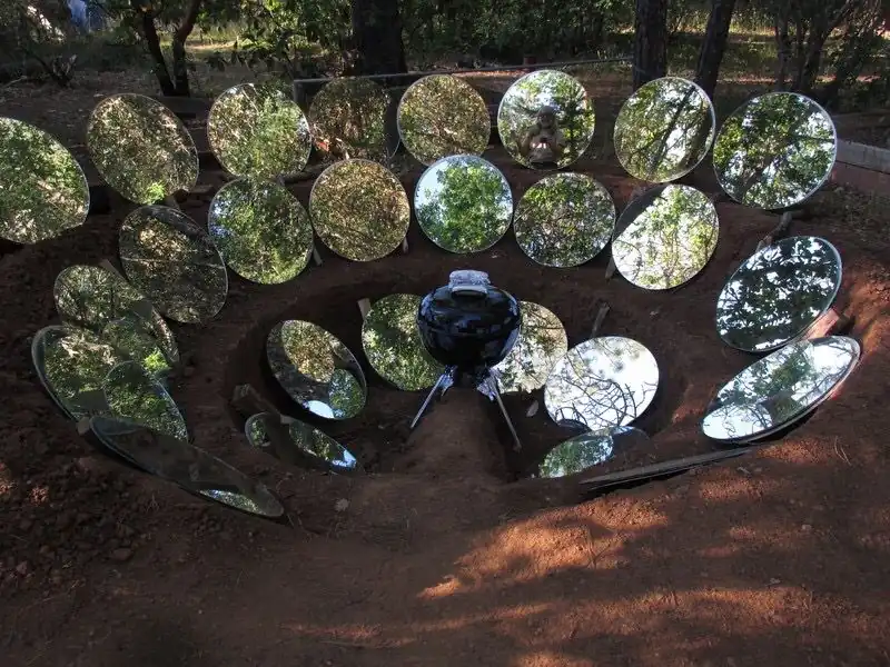 على موقد يعمل بالطاقة الشمسية الأرضية هي منخفضة التكلفة ومنخفضة تصميم الأثر البيئي التي توخاها اورلاندو بارت [1] للاستخدام من قبل الفقراء في مخيمات اللاجئين والقرى في البلدان غير الصناعية الأمم. أنهى ما يقرب من 50 مرآة واحدة قطرها قدم حفرة كبيرة على شكل parabolicly في الأرض التي تصطف مع المواد العاكسة مثل قطع إنقاذها من المرايا والزجاج المكسور، وهذا انعكاس الأغطية يمكن أو مع التمويل، والغذاء الألومنيوم خدمة لوحات جمعت كل يوم من قبل 10:00 و، وتصميم بسيط تستخدم لمدة وثقب (ترابية الشمسية طنجرة). وتتركز أشعة الشمس لقاعدة ثقب حيث يمكن غلي 10 1 حاويات أسود غالون من الماء كل ساعة وتستخدم لإعداد الطعام أو الشرب. (ثقب قطره 7ft، 5ft طهاة عميق 10 غالونات من الأرز / ساعة 11:00 حتي 03:00 في يوم صيف 85f في جنوب وسط ولاية أوريغون.) يتم توزيع لوحات مع وجبات من الطعام المطبوخ والطاقة الشمسية. عندما تنظيفها، ويمكن استخدام لوحات عاكسة كما شخص الاستمالة المرايا التي تم جمعها حتى صباح اليوم التالي للطبخ بالطاقة الشمسية مرة أخرى. بقية لوحات على الأظافر إنقاذها يوضع في جانبي الحفرة.