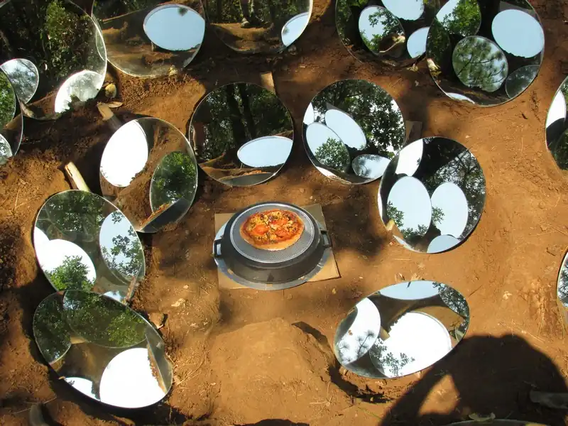 Kòm yon pati nan yon pwogram èd alimantè yo anpeche rtar timoun ki malnurished, pallets nan yon sèl legim galon asye pur nan bwat ta dwe avyon nan kan refijye aleka ak tout ti bouk. Kouvèti yo ka ta dwe espesyalman fèt yo dwe plat, glas fini sifas asye pur sa ki te kapab Lè sa a, dwe itilize kòm reflektè. Silend yo te ka rete yo ka itilize recho misil mòd oswa solè pou fè manje / dlo po pasterizasyon yon fwa nwasi plis pase yon dife bwa. Kòm kondisyon kan amelyore, ou ka yon mozayik plezi plis estheticly nan miwa ki kase ak Bits sifas ki gen koulè nan glas oswa twil yo mete nan yon plat tè. Ta ka tankou yon konsepsyon dwe antre nan pwojè piblik atizay mozayik yo, ajoute yon lòt dimansyon travay la fini; entegrasyon an of Art, ak fonksyon nan yon fason ki bay pou bezwen yo siviv debaz nan pasterizasyon dlo potab ak yon fason lib yo kwit manje san yo pa gen kolekte epi boule bwa. Kwizinyèr an tè ki Solè tou fonksyone tankou yon rekritman dlo pandan ke li lapli ak si enstale sou tèt la nan yon Mound gwo leve soti vivan nan tè a, ka yon tiyo drenaj dwe enkli ranpli veso. Bò solèy leve ak nan lwès ap fè fas mi bò nan Mound an ta bay plis espas pou adjasan tèr kwizinyèr Solè pèmanans positionné resevwa maten ak nan fen solèy apremidi pou manje maten pou kwit manje ak dine.