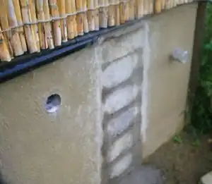 - Build the walls of each chamber with dried adobe blocks, rock and mortar, or ferrocement. Pedregal used cement. Chambers should be separated by a partition walls of similar thickness (as foundation?--10 cm. or 3.9 inches, approx.), which will also provide structural support to the upper part of the bathroom structure. If using something other then cement for the chambers, it is essential that the inside surfaces of the chamber walls be prepared with an impermeable coating, in order to counteract the decomposing action of excrement and bacterial organisms on the walls. This coating also helps to prevent moisture from entering the chambers. Each of these chambers should have its own side access door (or back access door--as in illustration) to allow for compost removal individually. Doors should be 30cm (11.8 inches, approx.) wide, and as tall as the chamber walls, to facilitate access to all composted materials within the chamber.