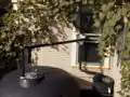 A different style of roof washer. This summer we installed a commercially available roof washer that uses a programmable valve to divert a rain's first flow away from the cistern. A purported advantage is the absence of standing water that can stagnate and potentially contaminate the cistern water. (This could happen, for example, if the trickle valve on the conventional device were to clog or it were left closed.) Below are two photos of the system with this new device. The first photo shows the roof washer mounted on a window frame near the cistern. Rainwater, which enters from the two downspouts above, can be observed from inside the dwelling. The first flush is diverted downwards into a holding barrel. An overflow hose from the top of the cistern also empties into this barrel. Post-flush water enters the cistern via the roof washer's side port through a screened cistern entry hole. The barrel overflow is directed to a swale in the middle of our back yard.