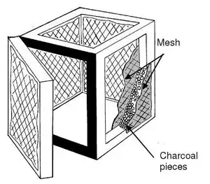 The charcoal cooler is made from an open timber frame of approximately 50mm x 25mm (2" x 1") in section. The door is made by simply hinging one side of the frame. The wooden frame is covered in mesh, inside and out, leaving a 25mm (1") cavity which is filled with pieces of charcoal. The charcoal is sprayed with water, and when wet provides evaporative cooling. The framework is mounted outside the house on a pole with a metal cone to deter rats and a good coating of grease to prevent ants getting to the food.