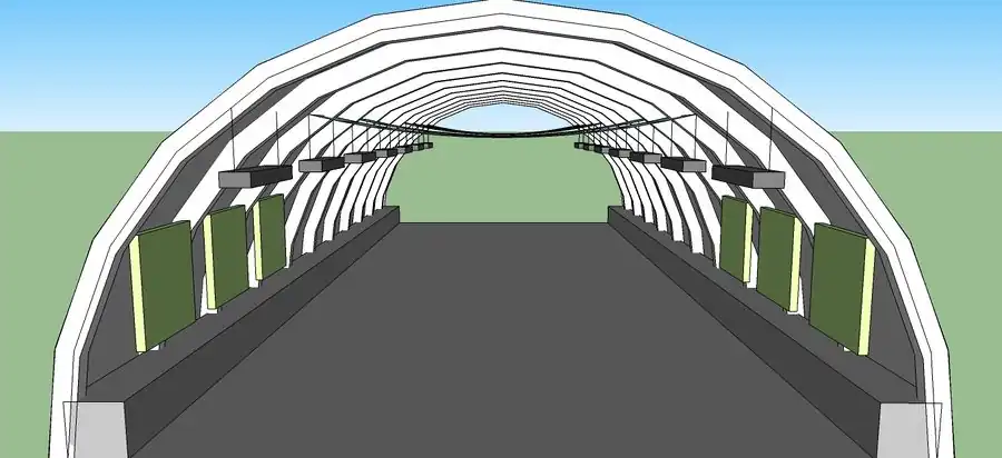 Acoustic panels and acoustic banners are used to improve the acoustics within the Humboldt Coastal Nature Center. The acoustic panels are filled with a material that is recycled, and will diffuse sound well. Some recycled, sound absorbing material that are being considered are newspaper, sheared wool, packing peanuts, egg cartons, and dry beachgrass. The panels are constructed with 2x4s, burlap fabric, a recycled sound absorbing material, and chicken wire. The panels are mounted to the walls in the open part of the building. We positioned them here because it is where most of the visitors gather, so this is the area that has the greatest sound generation in the building. The Acoustic banners are hung between the already existing light fixture mounts in the Eastern half of the building and hung vertically between the light fixture mount and the light fixtures themselves in the Western half of the building. Both types of banners are made from a long strip of fabric. For the banners hung between the light fixture mounts there is a specific rigging system. The ends of the banners are secured in between two pieces of wood and bolted together and tightened with a wing nut. A cable is then attached to the banner and then attached to the light fixture mount.