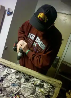 Fill fabric covered panel with filling such as newspaper, dry trash, wool, or (but not limited to) insulation. Then cover with chicken wire and staple secure.... (Photo by Kayla Morris)