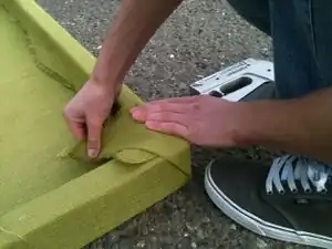 Fold left over fabric corner over and staple within frame. We did not cut it due to fear of fraying. The corners will be hidden once panel is filled.... (Photo by Michael Harrow)