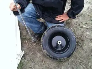 Two wheelbarrow wheels are attached to a metal axle to be added to the stretcher for use as a wheelbarrow. The wheels are six inches apart to spread out the load of the weight so that it will be easier to use on sand.