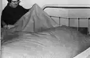Making up the feather bed is another trick, because it is so soft every imprint shows up easily. When you get up in the morning, it is all crumpled down. First you shake all the feathers to one side, then turn the tick over. Push and smooth the feathers with your hand so it will be smooth. Also another way of making it look nice and smooth is to take a broomstick handle and run it across the tick. People were not allowed to sit on the feather bed during the day, nor could children play on it or they would spoil the smooth finished appearance.